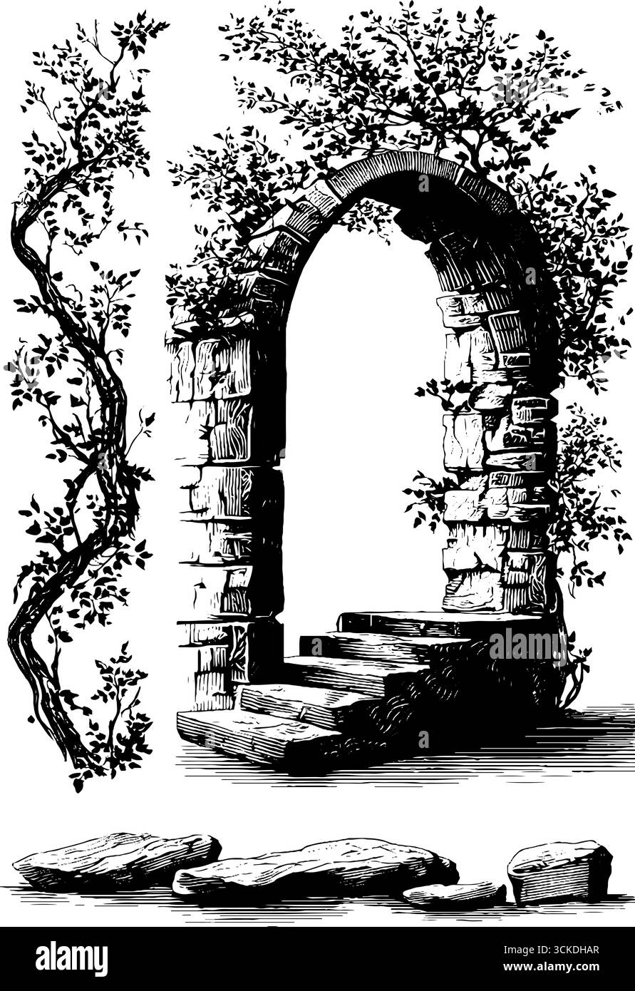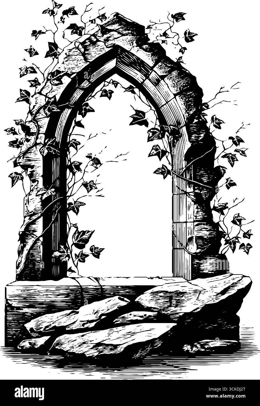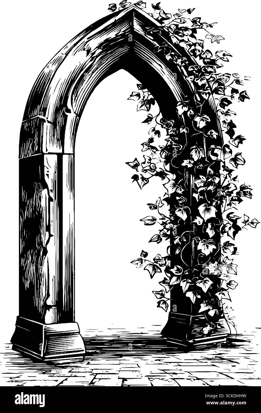 Gotischer Vintage-Bogen mit Efeu-Reben-Gravur für architektonisches Design und Dekoration. Stock Vektorhttps://www.alamy.de/image-license-details/?v=1https://www.alamy.de/gotischer-vintage-bogen-mit-efeu-reben-gravur-fur-architektonisches-design-und-dekoration-image700392752.html