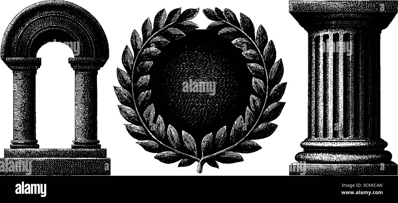Vintage-architektonisches Ornament-Set mit Bogen, Keystone und Säule für Designprojekte. Stock Vektorhttps://www.alamy.de/image-license-details/?v=1https://www.alamy.de/vintage-architektonisches-ornament-set-mit-bogen-keystone-und-saule-fur-designprojekte-image700519981.html