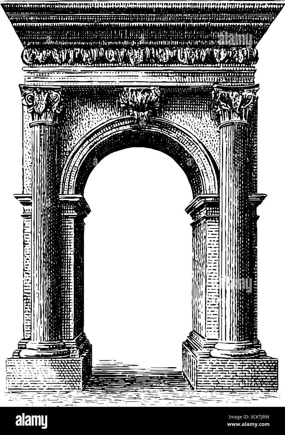 RF3CKTRB5–Klassischer Bogenpfeiler im Vintage-Gravurstil für historische Designprojekte.