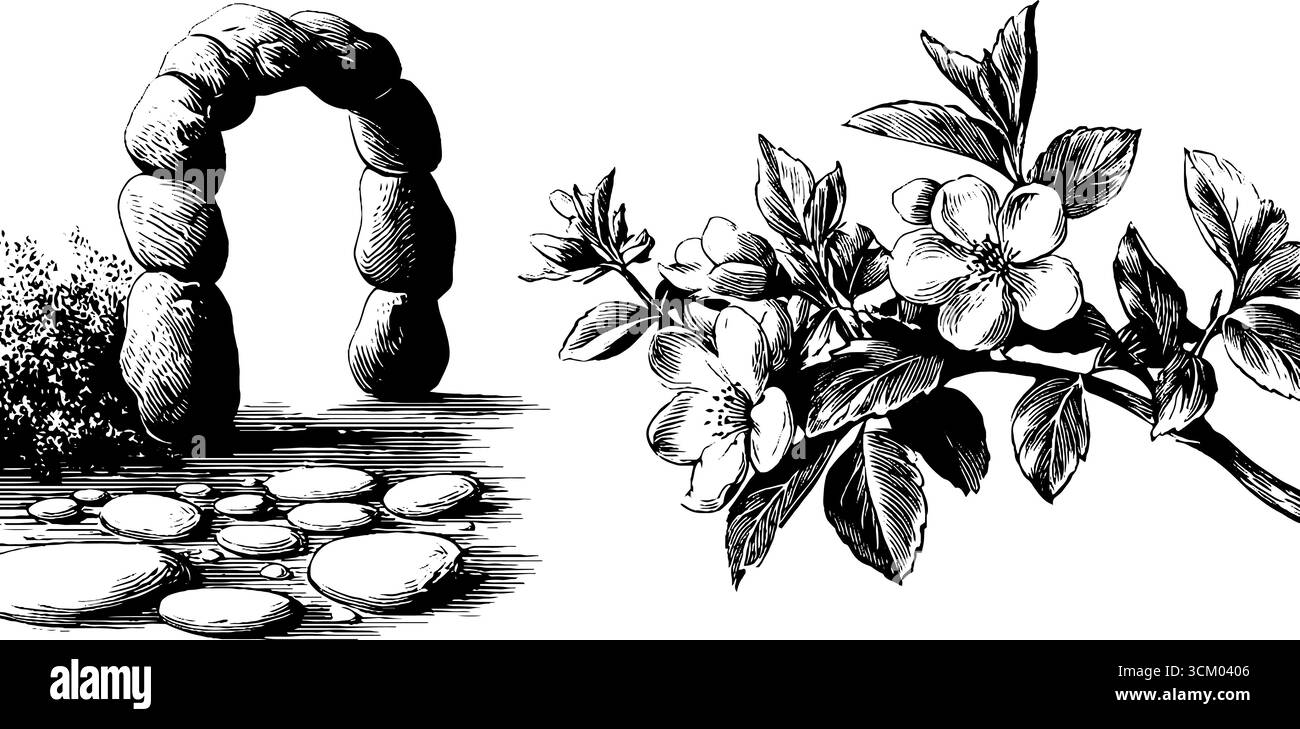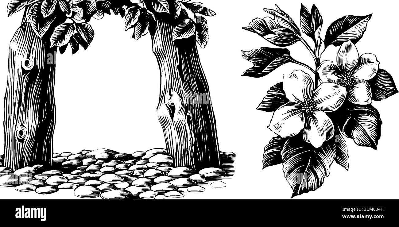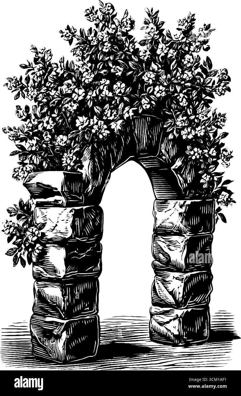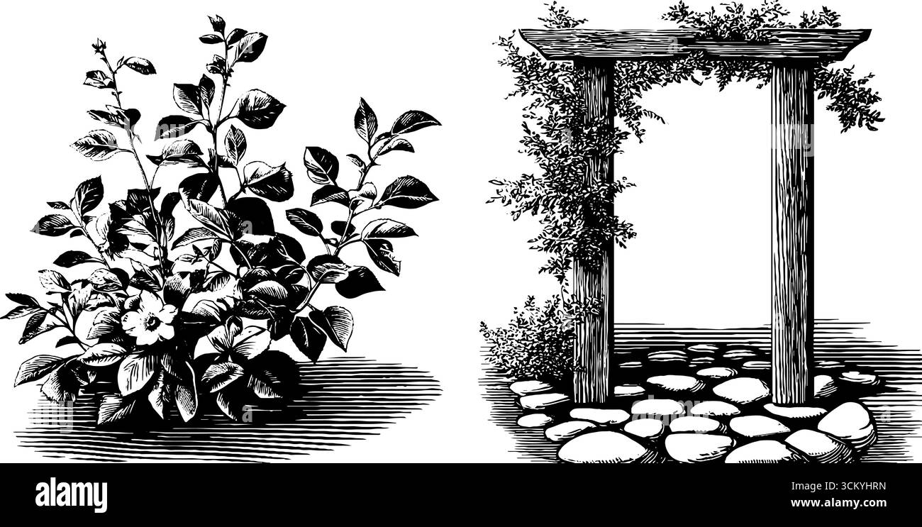Vintage-Gartenbogen und nachgestelltes Geißblatt-Design für botanische Projekte. Stock Vektorhttps://www.alamy.de/image-license-details/?v=1https://www.alamy.de/vintage-gartenbogen-und-nachgestelltes-geissblatt-design-fur-botanische-projekte-image700710982.html