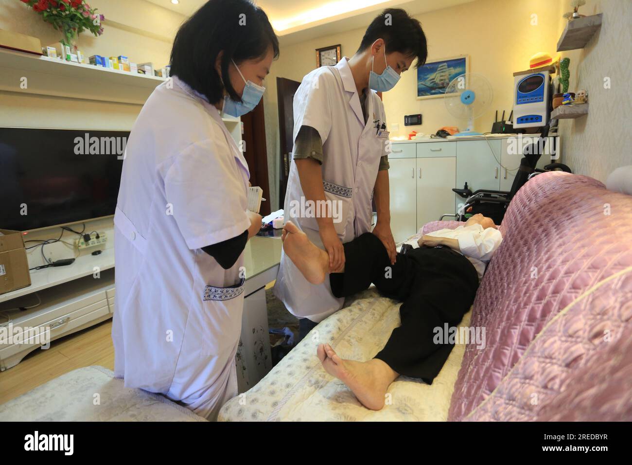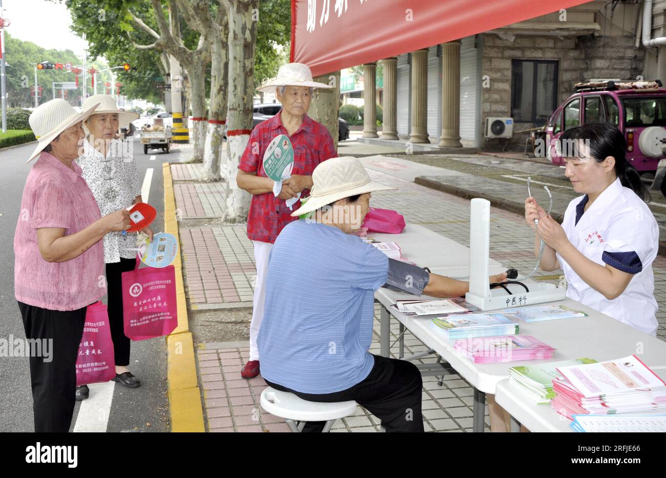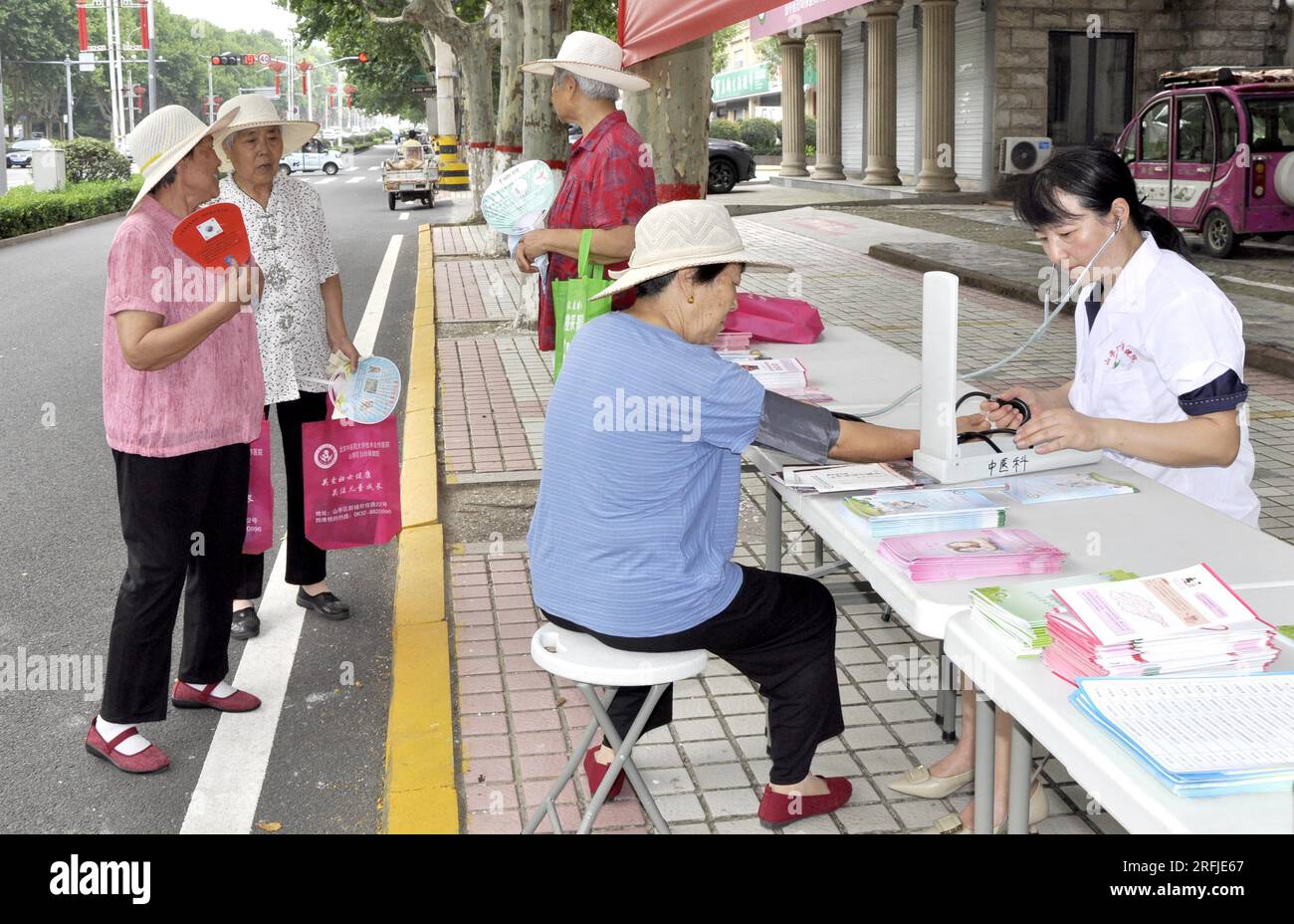 RM2RFJE68–ZAOZHUANG, CHINA - 4. AUGUST 2023 - Medizinisches Personal führt Gesundheitsinformationsförderungsdienste wie körperliche Untersuchung und Stillen für PEO durch