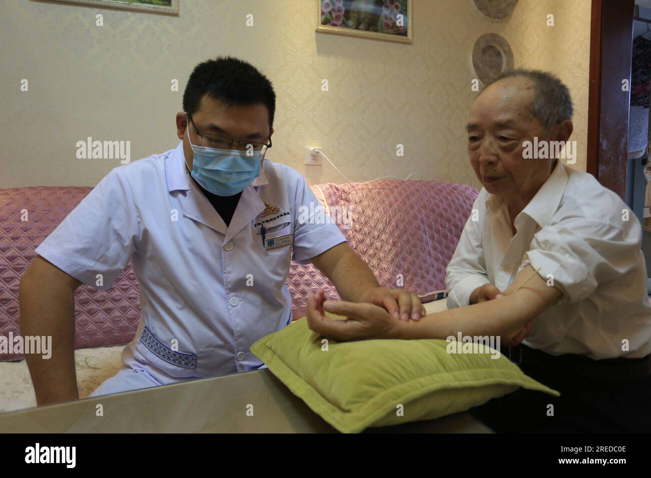 RM2REDC0E–GUIYANG, CHINA - 26. JULI 2023 - Ein TCM-Arzt gibt einer älteren Person in Guiyang, Provinz Guizhou, China, eine kostenlose körperliche Untersuchung ab, 26. Juli 202