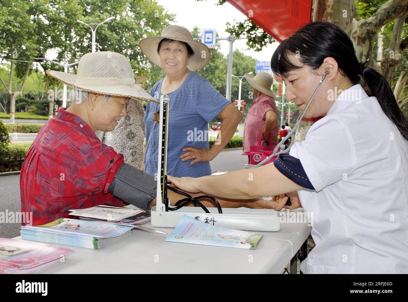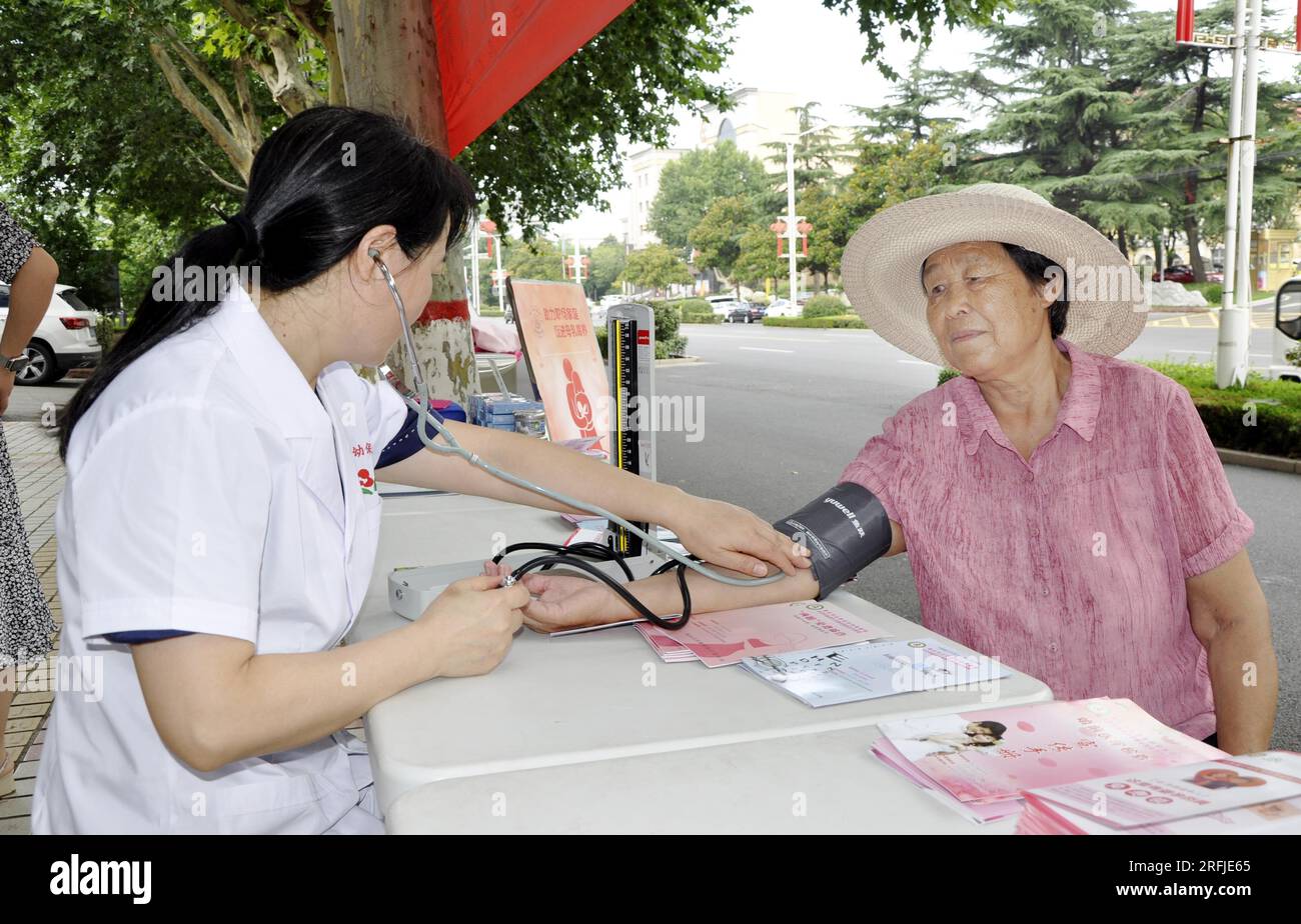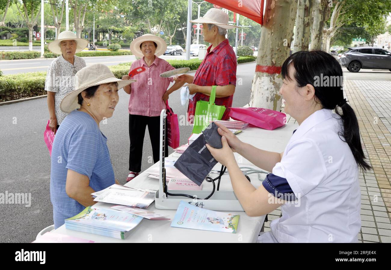ZAOZHUANG, CHINA - 4. AUGUST 2023 - Medizinisches Personal führt Gesundheitsinformationsförderungsdienste wie körperliche Untersuchung und Stillen für PEO durch Stockfotohttps://www.alamy.de/image-license-details/?v=1https://www.alamy.de/zaozhuang-china-4-august-2023-medizinisches-personal-fuhrt-gesundheitsinformationsforderungsdienste-wie-korperliche-untersuchung-und-stillen-fur-peo-durch-image560357909.html