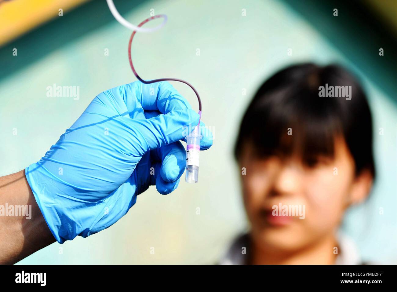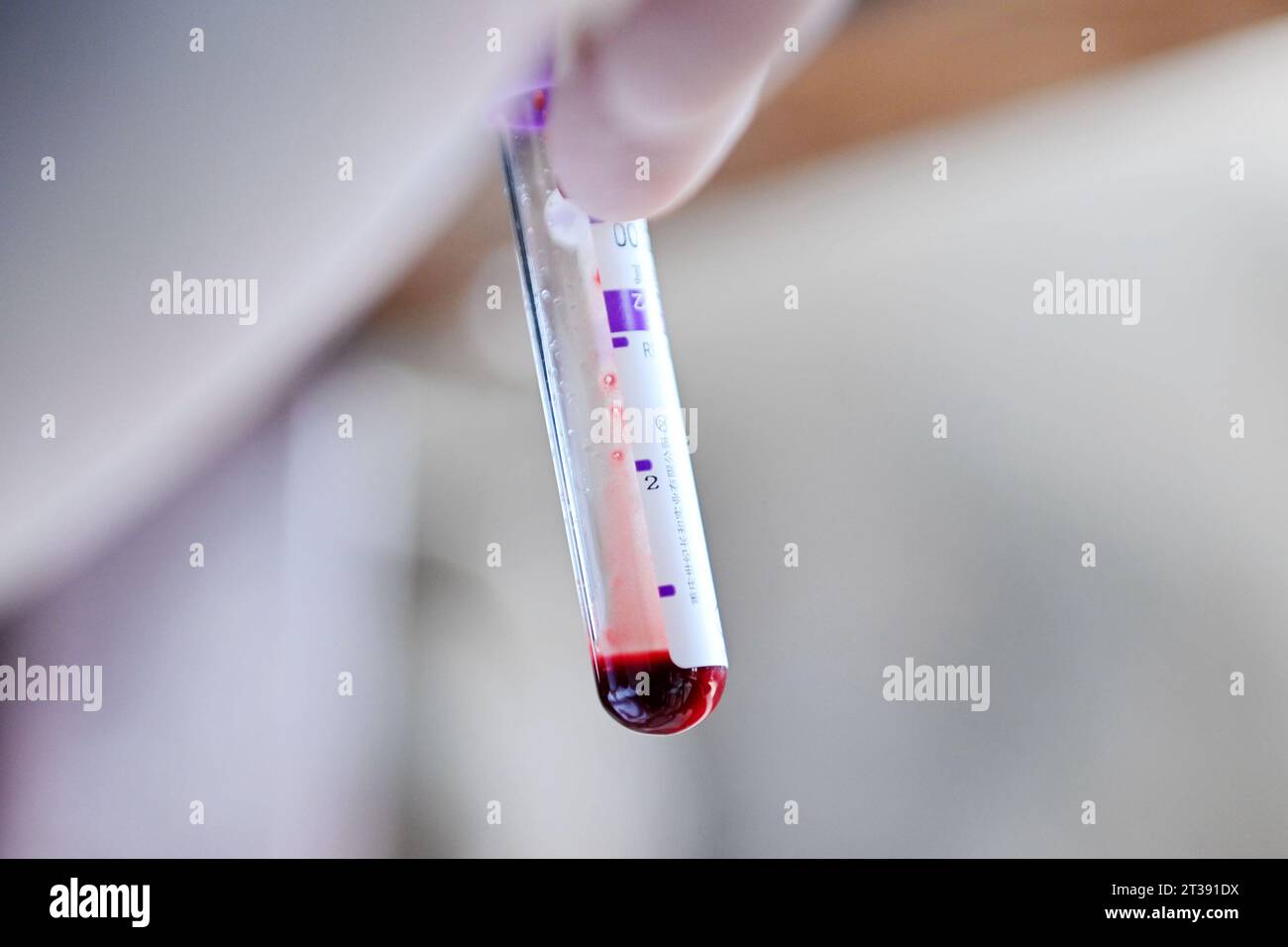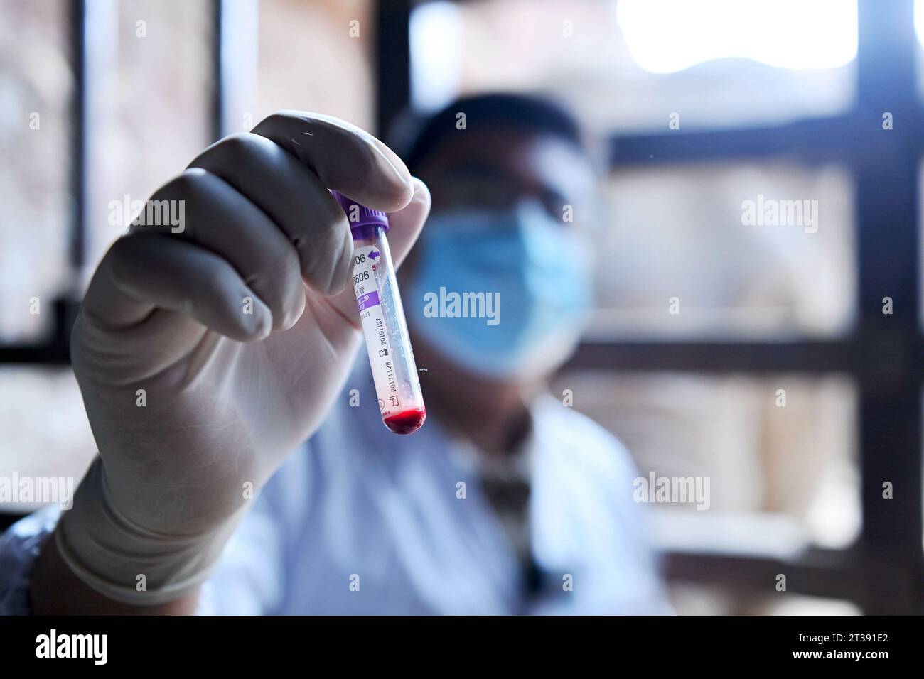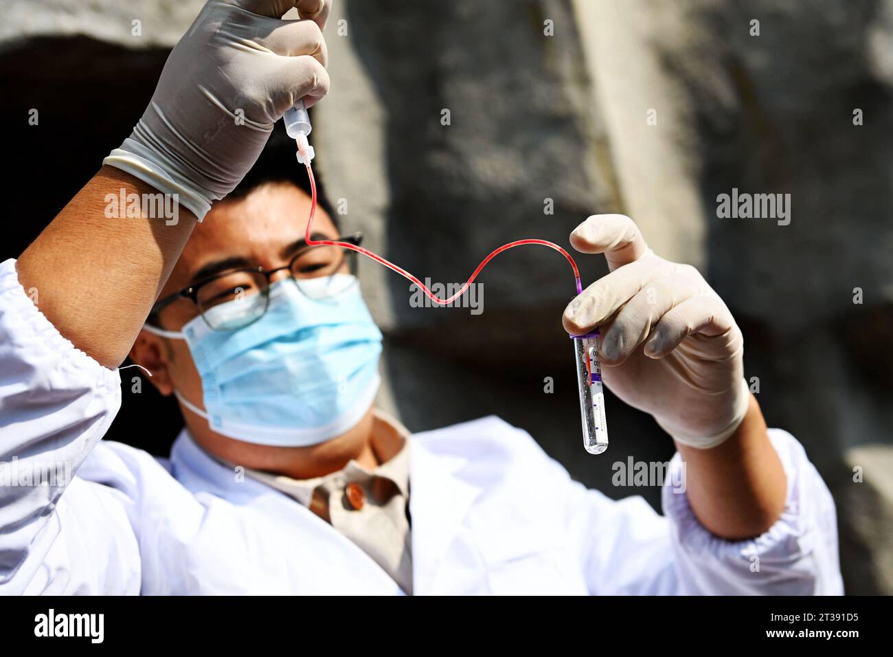 RM2T391E2–QINGDAO, CHINA - 24. OKTOBER 2023 - Ein Tierarzt zeigt Proben von Blut asiatischer Elefanten in der Forest Wildlife World in Qingdao, dem ostchinesischen Shandon