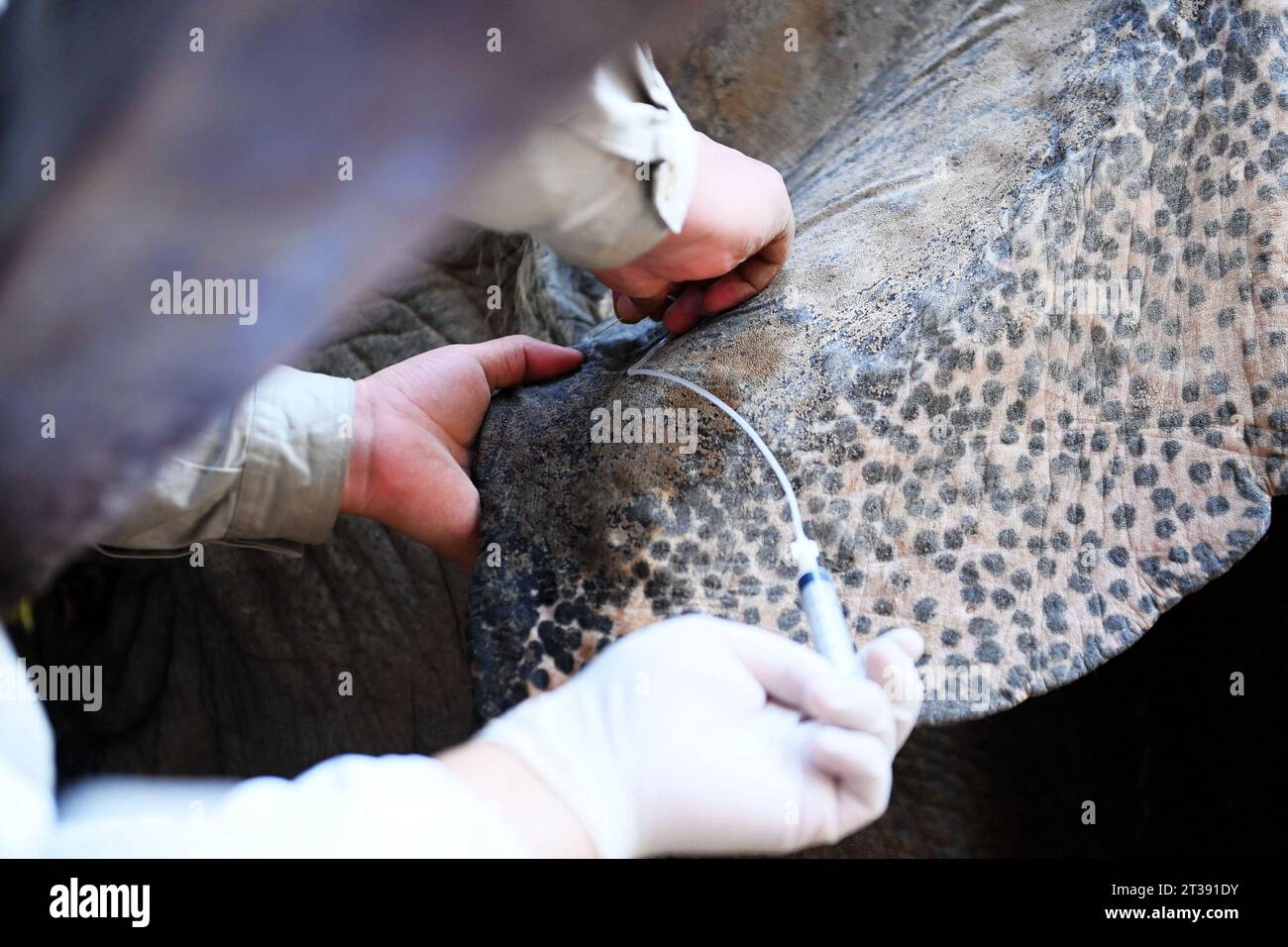 QINGDAO, CHINA - 24. OKTOBER 2023 - Ein Tierarzt zieht Blut aus dem Ohr eines asiatischen Elefanten für Tests in der Forest Wildlife World in Qingdao. Stockfotohttps://www.alamy.de/image-license-details/?v=1https://www.alamy.de/qingdao-china-24-oktober-2023-ein-tierarzt-zieht-blut-aus-dem-ohr-eines-asiatischen-elefanten-fur-tests-in-der-forest-wildlife-world-in-qingdao-image569984855.html