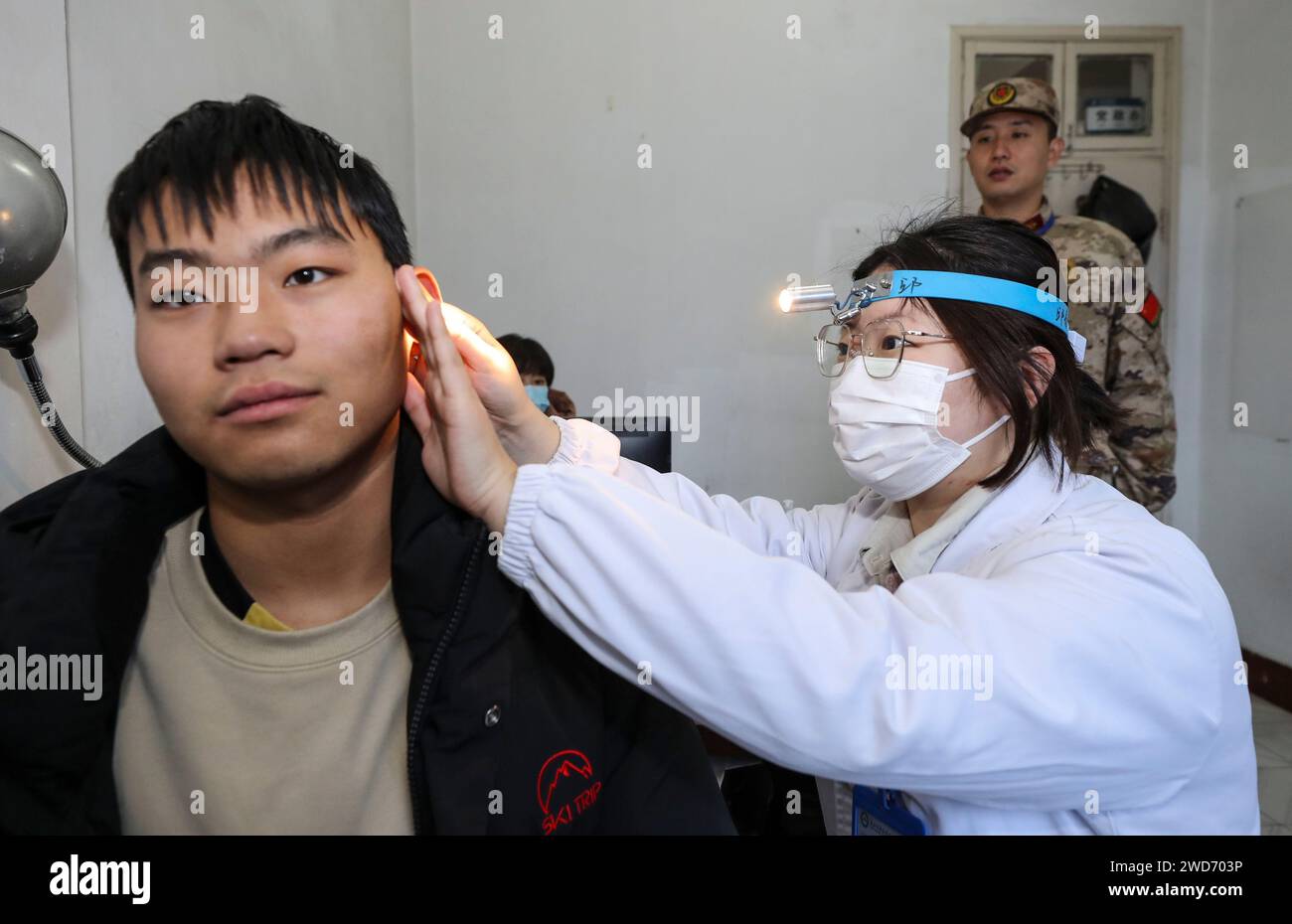 HUAI'AN, CHINA - 19. JANUAR 2024 - Ein Arzt untersucht die Ohren junger Bewerber in der Stadt Huai'an, Provinz Jiangsu, China, 19. Januar 2024. Stockfotohttps://www.alamy.de/image-license-details/?v=1https://www.alamy.de/huaian-china-19-januar-2024-ein-arzt-untersucht-die-ohren-junger-bewerber-in-der-stadt-huaian-provinz-jiangsu-china-19-januar-2024-image593296810.html