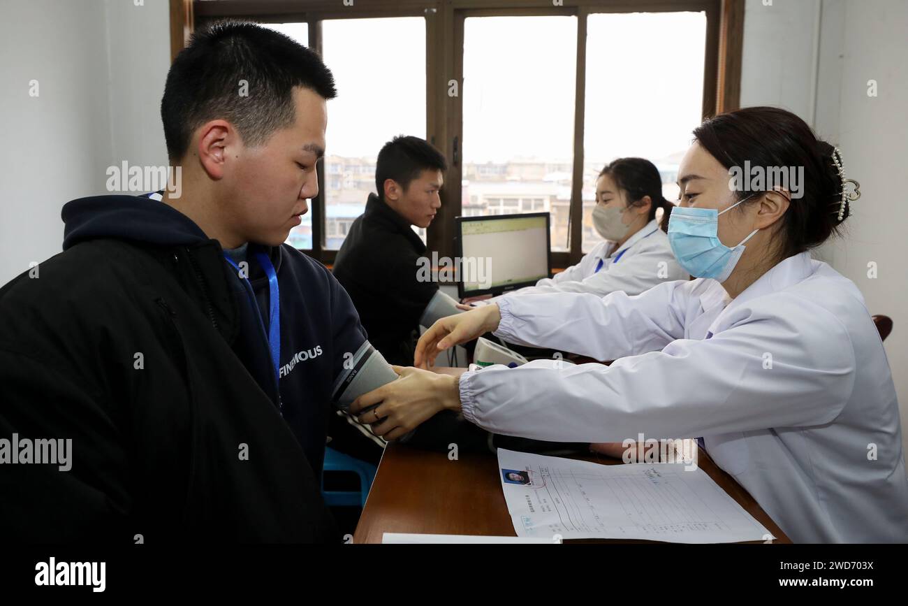 RM2WD703X–HUAI'AN, CHINA - 19. JANUAR 2024 - Ein Arzt misst den Blutdruck eines jungen Antragstellers in Huai'an Stadt, Provinz Jiangsu, China, 1. Januar