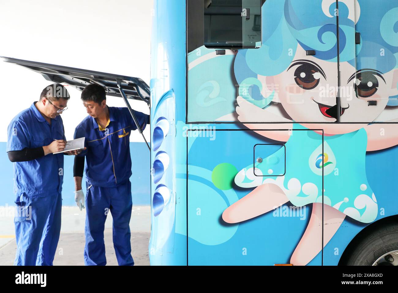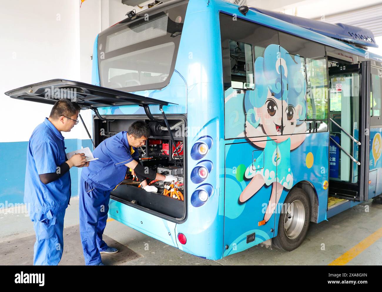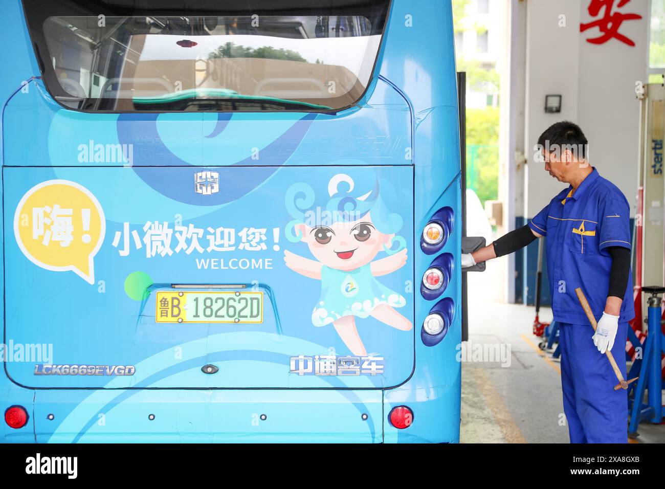 RM2XA8GXB–QINGDAO, CHINA – 5. JUNI 2024 – Wartungspersonal eines Busunternehmens führt eine „körperliche Untersuchung“ an einem Fahrzeug in Qingdao, Provinz Shandong, CH durch