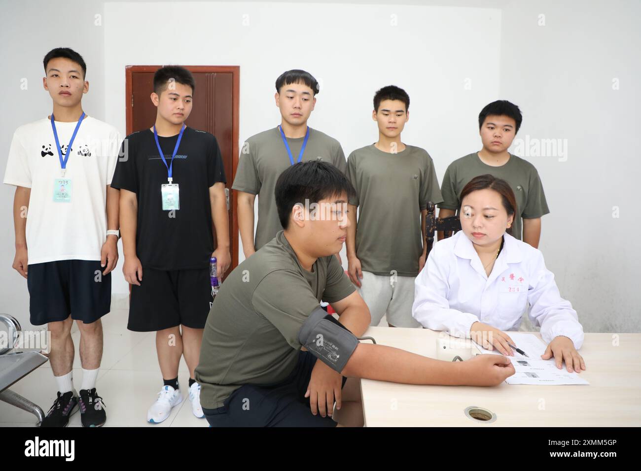 RM2XMM5GJ–YANCHENG, CHINA - 29. JULI 2024 - Junge Wehrpflichtige nehmen an einer körperlichen Untersuchung in einer Wehrpflichtstation in Funing County, Yanch, Teil