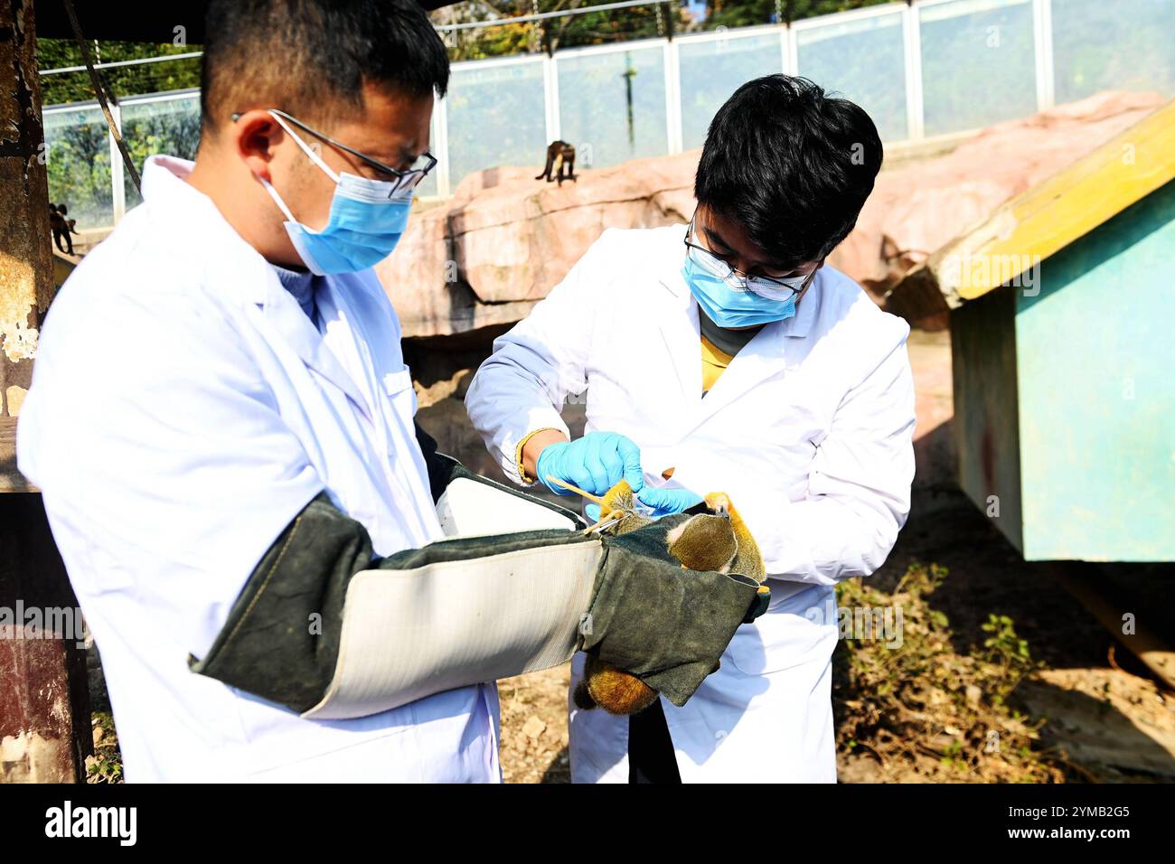 RM2T391D2–QINGDAO, CHINA - 24. OKTOBER 2023 - Ein Tierarzt gibt einem afrikanischen Löwen einen medizinischen Test in der Forest Wildlife World in Qingdao, Ostchinas S