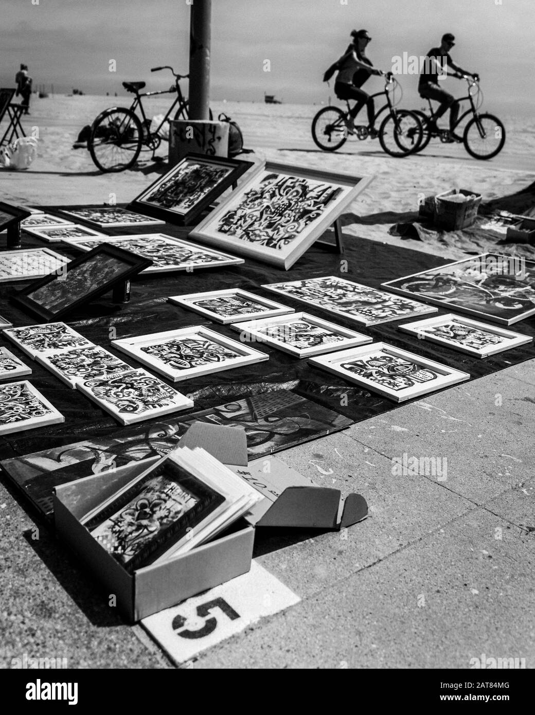 Kunstschau auf dem Venice Beach Boardwalk in Schwarzweiß mit einem Paar Reitfahrrädern. Stockfotohttps://www.alamy.de/image-license-details/?v=1https://www.alamy.de/kunstschau-auf-dem-venice-beach-boardwalk-in-schwarzweiss-mit-einem-paar-reitfahrradern-image341928064.html