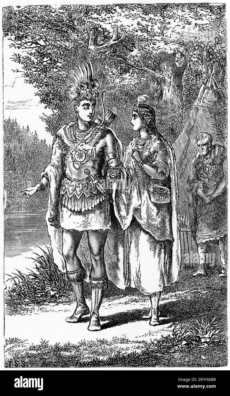 RM2RYHABB–Gravur eines jungen Paares in fantasievollen indischen Kostümen, das sein Dorf verließ, mit einem alten Mann, der in der Tür seines Tipi stand