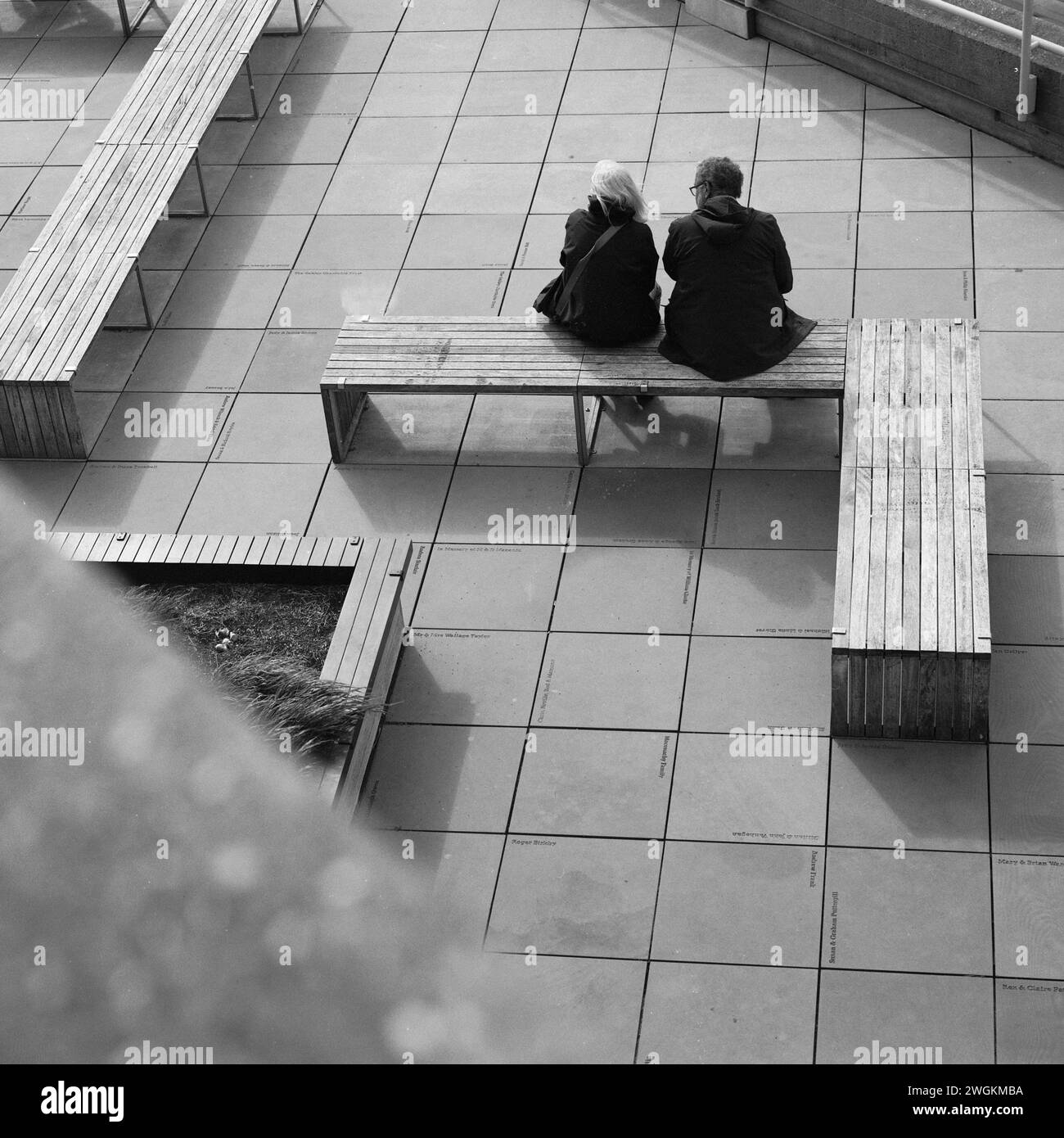 Ein verheiratetes Paar sitzt auf einer Bank vor dem National Theatre, South Bank, London Stockfotohttps://www.alamy.de/image-license-details/?v=1https://www.alamy.de/ein-verheiratetes-paar-sitzt-auf-einer-bank-vor-dem-national-theatre-south-bank-london-image595420094.html