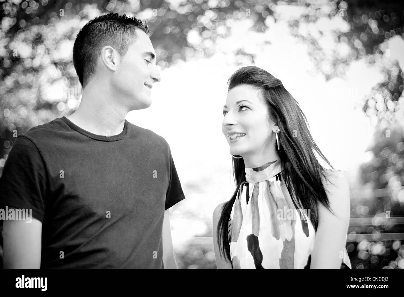 Ein glückliches junges Paar in ihrer Mitte der 20er Jahre lächelnd in schwarz und weiß. Stockfotohttps://www.alamy.de/image-license-details/?v=1https://www.alamy.de/stockfoto-ein-gluckliches-junges-paar-in-ihrer-mitte-der-20er-jahre-lachelnd-in-schwarz-und-weiss-47624587.html