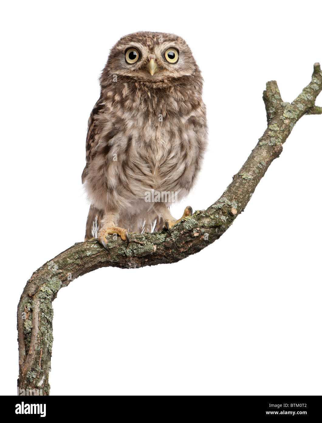 Junge Eule auf Ast vor weißem Hintergrund hocken Stockfotohttps://www.alamy.de/image-license-details/?v=1https://www.alamy.de/stockfoto-junge-eule-auf-ast-vor-weissem-hintergrund-hocken-32401826.html