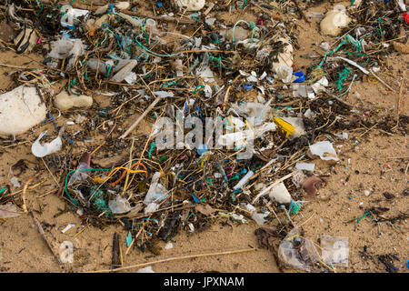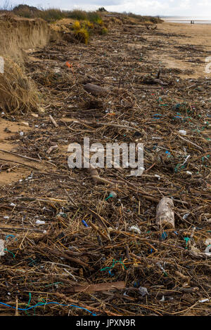 Haufen von verschiedenen Müll am Strand abgeholt. Atlantikküste. La France.