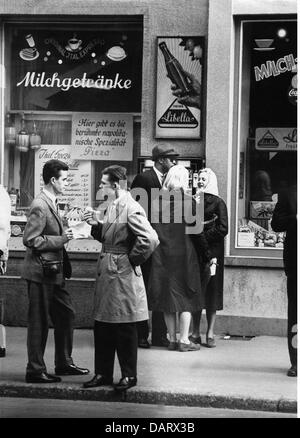 1950, historische, Mann im Mantel und Kappe auf dem Rücken eines Esels und Warenkorb Befüllen ein Metall Milchkanne mit frischer Milch aus einem Spender hängen von einer mobilen Einheit, Irland.