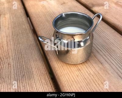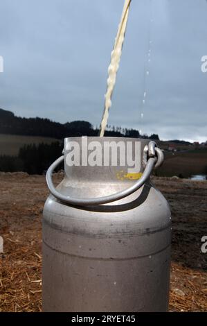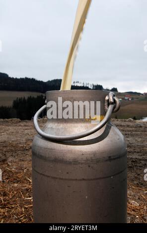 Landwirt Gießen Frischmilch in einer Milchkanne, Wenns, Österreich