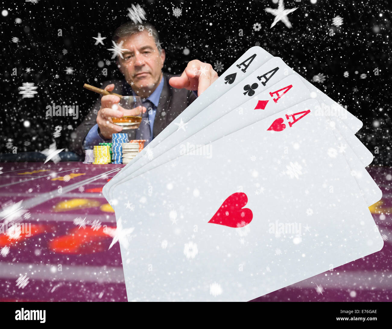 Zusammengesetztes Bild der Spieler halten Whisky am Pokertisch mit digitalen Hand von Karten im Vordergrund